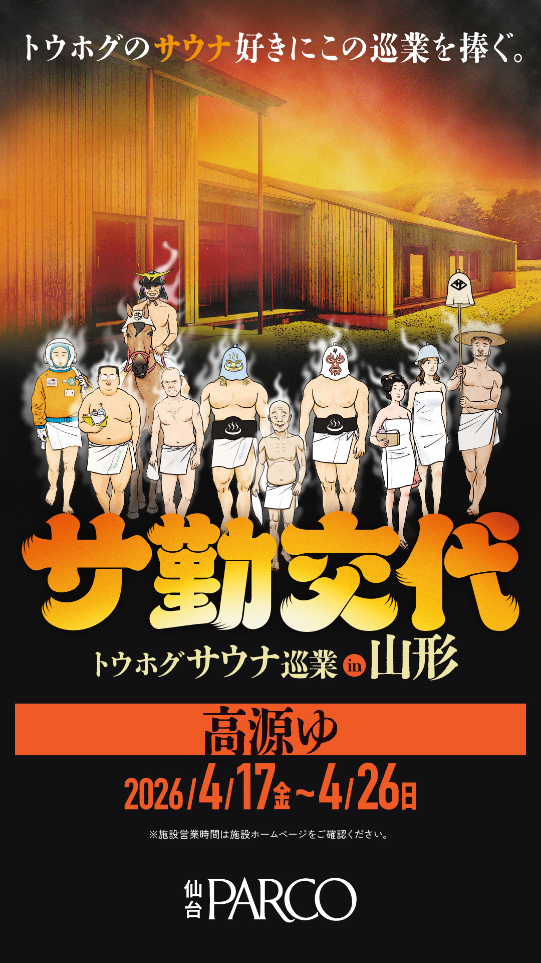 2026.4.17 サ勤交代の開催について トウホク各地のサウナを巡る、新たなムーヴメント。 多種多様な“サウナー”たちに、魅力あふれる東北のサウナ施設を訪れてほしい そんな想いから生まれた、現代版“参勤交代”をコンセプトにしたサウナ企画『サ勤交代』 が高源ゆにて開催! 開催期間:4月17日(金)〜4月26日(日) 期間中は、サ勤交代オリジナルグッズ、コラボグッズの販売も実施します。 東北サウナの魅力を体感しに、ぜひお立ち寄りください。